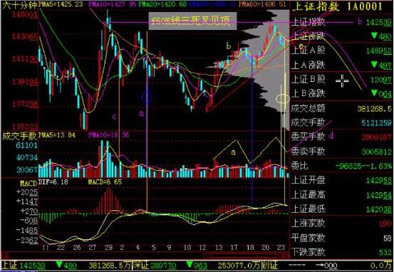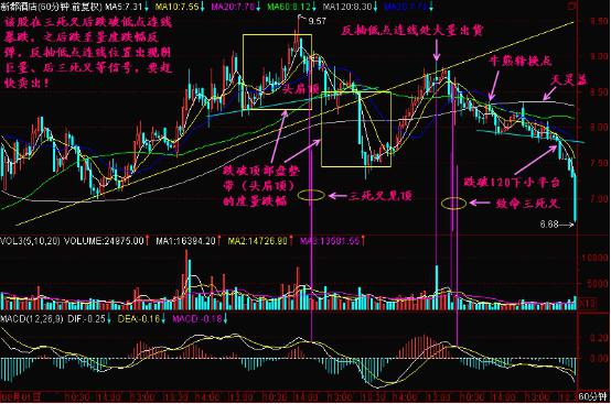 如上圖所示該股的頭部區(qū)間60分K線,有三組三死叉信號,其中第一二兩組組合成三死叉頭背離,60分鐘的三死叉就是一個短期頭部的信號,必須出貨!