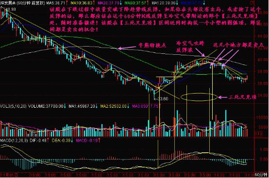 如上圖所示,該股在下跌過程中放量突破下降趨勢線反彈,如果你在頭部沒有出局、或者搶了這個反彈的話,那么都應該在這個60分鐘K線反彈至冷空氣帶附近那個三死叉又見頂處,隨時準備撤退!該股在三死叉又見頂區(qū)間還同時構筑了一個小型的圓弧頂,那區(qū)間都是賣出的機會!