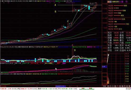 股改后復牌的個股,其價格與股改前的收盤價會有“斷裂”,由于最近大盤走高,大部分個股有補漲,于是頻頻出現(xiàn)“跳空缺口”。復牌當日,還會出現(xiàn)巨量,如(圖一)中D處。你能判斷莊家的意圖嗎?巨量是拉高出貨?還是繼續(xù)收集籌碼?除非你看“靈穩(wěn)榜”,直接看清楚主動性買入量的增加情況,否則你是很難準確判斷的。