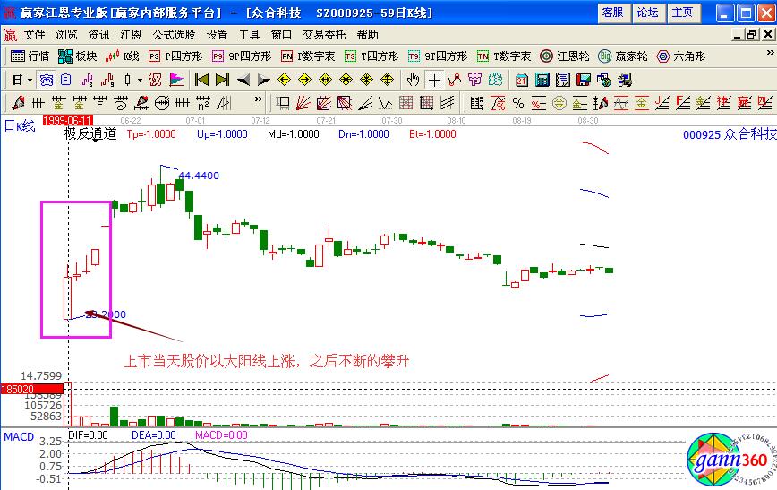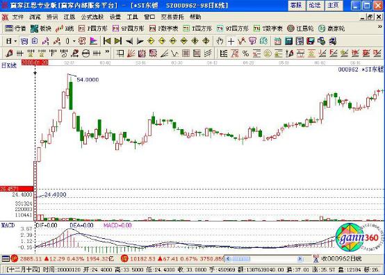 如下圖案例*ST東鉭(000962)在2000年1月20日上市,開盤價(jià)24.4元便成為最低價(jià),當(dāng)日強(qiáng)勢(shì)上攻,以幾乎最高價(jià)33.08元報(bào)收,成交4500萬(wàn)股,約占流通盤6500萬(wàn)股的70%,明顯屬于主力資金的拉高建倉(cāng)行為,第二天低開高走,以光頭的陽(yáng)線報(bào)收。至此,可基本確定為一頭短線瘋牛,投資者即可及時(shí)跟進(jìn),其后短短數(shù)天升幅高達(dá)50%。