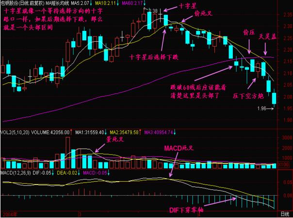 如圖包鋼股份在04年的股價(jià)走勢(shì)形態(tài),在頂部的時(shí)候形成了十字星的走勢(shì),就像是一個(gè)等待選擇方向的十字路口,如果后期選擇下跌,就是一個(gè)頭部區(qū)間,而圖中選擇的是下跌的走勢(shì),均線形成了價(jià)死叉的形態(tài),之后股價(jià)由于受到均線的壓制,投資者可以在頭部出現(xiàn)十字星形態(tài)的時(shí)候,選擇及時(shí)的賣出獲利,以規(guī)避后期股價(jià)走勢(shì)的下跌形態(tài),而造成的資金損失。同時(shí),均量線與macd指標(biāo)都形成了死叉的走勢(shì)形態(tài),給出了賣出的信號(hào),預(yù)計(jì)著股價(jià)的下跌走勢(shì)形態(tài);