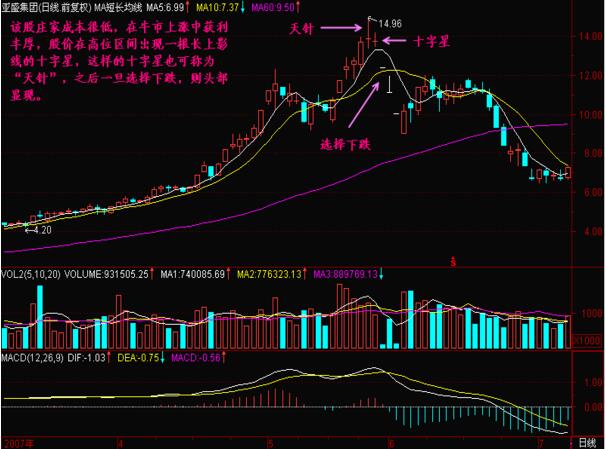 如圖該股在07年4月到7月的股價(jià)走勢(shì),起初,莊家成本是很低的,在牛市中不斷的上漲獲利,股價(jià)在高位區(qū)間出現(xiàn)了一根具有長(zhǎng)上影線的十字星,也可以說是“天針”,之后股價(jià)選擇下跌,形成了跌停板,而且均線形成的是死叉的賣出信號(hào),投資者應(yīng)該及時(shí)的把握操作的機(jī)會(huì),在實(shí)戰(zhàn)中做好相應(yīng)的投資策略。