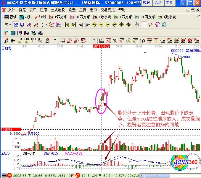 然而實(shí)戰(zhàn)中的操作技巧,還需要通過(guò)實(shí)例進(jìn)行分析,如圖皇庭國(guó)際(000056)在2011年4月29日的股價(jià)走勢(shì),處于一波上漲的趨勢(shì)中,突然出現(xiàn)了一根下跌的陰線,對(duì)應(yīng)的成交量縮小,但是macd的紅柱線卻在不斷的拉長(zhǎng),所以該形態(tài)的下跌走勢(shì),有可能是假陰線,也就是假的下跌形態(tài),目的是想要投資者出局,這個(gè)時(shí)候投資者要注意及時(shí)的觀察其走勢(shì)變化,后市的看漲行情嚴(yán)重。