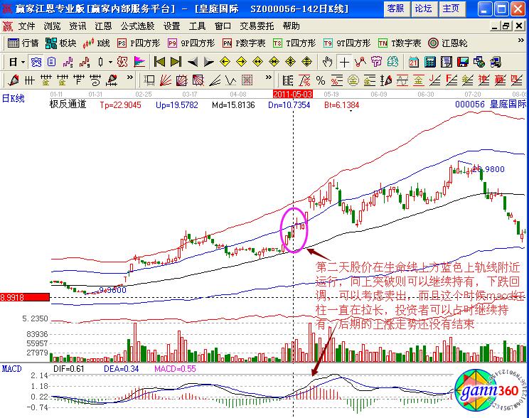 在極反通道中進(jìn)行分析,在5月3日的時(shí)候,股價(jià)已經(jīng)出現(xiàn)了上漲的走勢(shì),說(shuō)明前一天的陰線是假摔的現(xiàn)象,此時(shí)的股價(jià)在藍(lán)色上軌線的位置運(yùn)行,如果向上突破可以繼續(xù)持有,下跌回調(diào)的話,可以考慮賣出,而且這個(gè)時(shí)候?qū)?yīng)的macd紅柱線在不斷的拉長(zhǎng),在出現(xiàn)逐漸縮短的形態(tài)時(shí)候,投資者要及時(shí)的賣出。