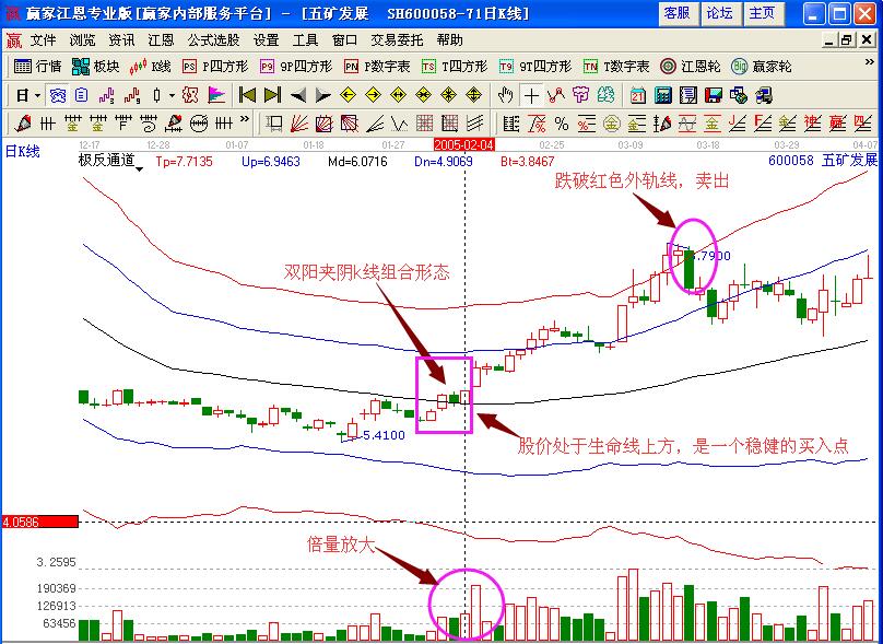 當(dāng)然更加準(zhǔn)確的買(mǎi)賣(mài)點(diǎn)位置,可以通過(guò)贏家江恩軟件的極反通道工具進(jìn)行分析,如圖在05年2月4日的時(shí)候,股價(jià)K線形成了雙陽(yáng)夾陰的走勢(shì)形態(tài),而且這個(gè)時(shí)候的股價(jià)處于生命線的上方運(yùn)行,是一個(gè)穩(wěn)健的買(mǎi)入點(diǎn),再結(jié)合倍量柱的基本形態(tài),更加確信了買(mǎi)入點(diǎn)的位置,之后股價(jià)一路上漲突破了藍(lán)色上軌線,在8.79的位置處向下跌破了紅色外軌線,是一個(gè)上漲受阻,賣(mài)出的操作信號(hào),投資者可以積極的賣(mài)出。