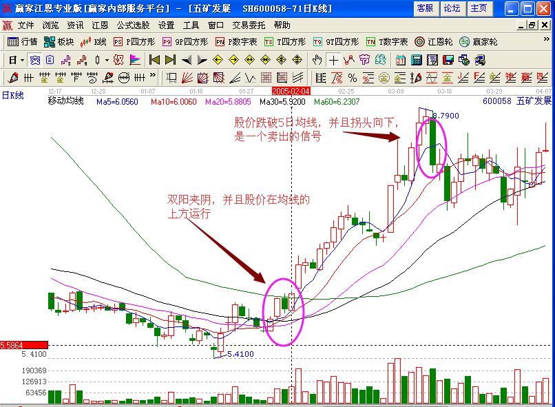 具體的實(shí)戰(zhàn)案例如圖五礦發(fā)展(600058)在2005年2月4日的股價(jià)走勢(shì)變化,形成了“雙陽(yáng)夾陰”的K線組合形態(tài),而且第二根K線在5日均線的上方運(yùn)行,短期均線也形成了多頭排列的基本形態(tài),而且對(duì)應(yīng)的成交量形成的是倍量放大的走勢(shì),在介入該股之后,股價(jià)一路沿著5日均線向上運(yùn)行,雖然中間有小幅的下跌走勢(shì),但是整體的行情是上漲的走勢(shì),所以投資者可以放心的持有,在股價(jià)向上運(yùn)行到8.79元的價(jià)位之后,出現(xiàn)了一根大陰線,向下跌破了5日均線的支撐作用,并且均線也出現(xiàn)了拐頭向下的走勢(shì)形態(tài),這個(gè)時(shí)候投資者可以考慮及時(shí)的賣(mài)出獲利。