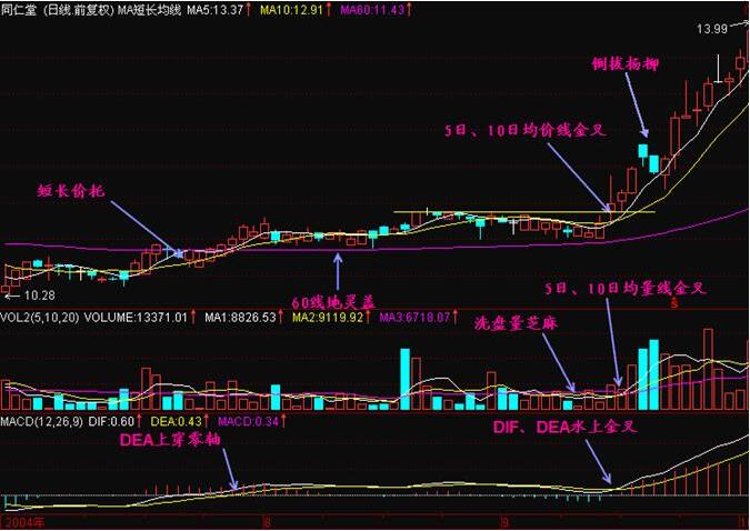 如圖同仁堂在2004年8月到9月的日K線股價走勢,經(jīng)過長達一個月的橫盤走勢,股價出現(xiàn)了短長價托的走勢形態(tài),在向上突破的時候,5日均線與10日均線形成了金叉走勢,同時對應的均量線也形成了金叉形態(tài),但是量能卻是很小的洗盤量芝麻,結合macd指標進行分析,dea向上上穿0軸,兩線在0軸上方形成了水上金叉的形態(tài),此時形成了三金叉見底的走勢形態(tài),投資者可以在形成進行的位置進行買入操作,等待后市的上漲變化。