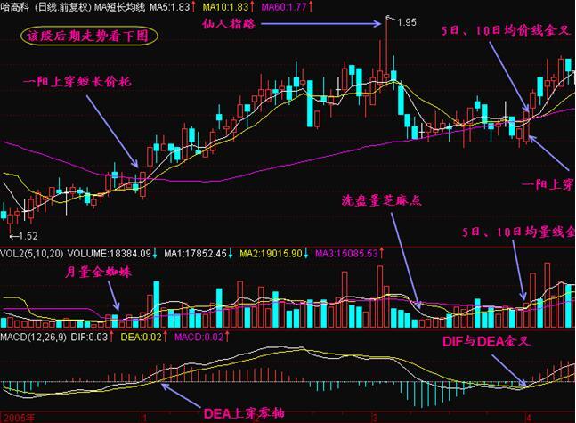與此對比的,觀察哈高科在2005年1月到4月的股價走勢變化,股價K線在走勢變化中,形成的有一陽上穿短長價托,與仙人指路的K線組合形態(tài),在下跌回調(diào)的走勢中,形成的是三金叉見底的形態(tài),同時形成了一陽穿多線的的走勢形態(tài),預示著上漲的操作行情,此時投資者可以積極的介入等待上漲獲利。