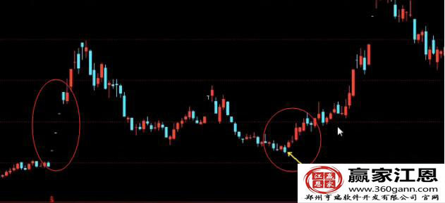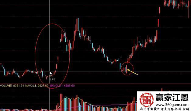 圖例2:該股與例1不同的是,股價的漲勢幅度較小,股價從低位向上拉升,三個一字漲停板,經(jīng)過了很長一段時間的下跌回調(diào),在第一個漲停板的時候,形成股價支撐,再次向上拉升,投資者可以積極介入,股價走勢形成對稱概念股,是一個不錯的介入點位置。