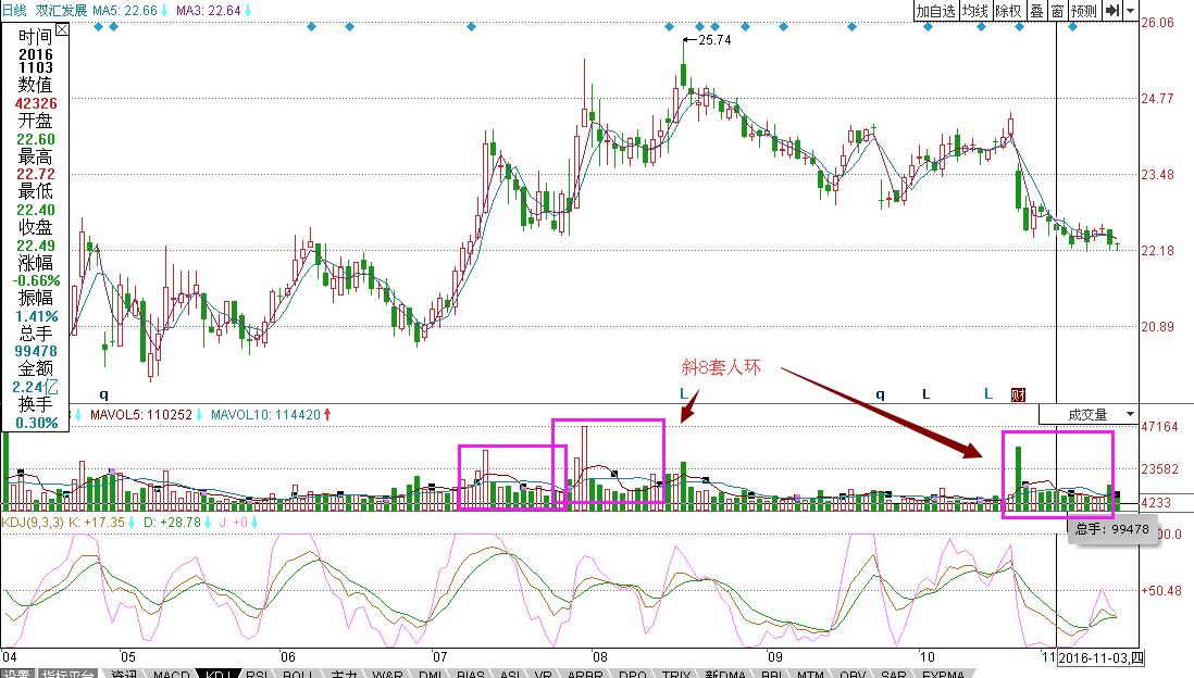 對(duì)比該股在近期2016年的股價(jià)走勢(shì)形態(tài),在2016年7月、8月、11月的時(shí)候,都出現(xiàn)了斜8套人環(huán)的均量線走勢(shì)形態(tài),并且是在成交量出現(xiàn)異動(dòng)天量柱的時(shí)候產(chǎn)生的,投資者可以對(duì)比上方的操作技巧進(jìn)行逐一的分析。