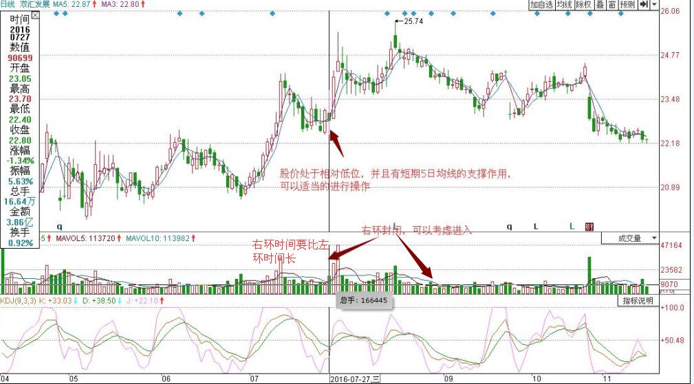 以2016年7月27日形成的斜8套人環(huán)為例進(jìn)行分析,前期股價(jià)經(jīng)過(guò)一個(gè)小幅的下跌走勢(shì),在7月27日的時(shí)候形成一個(gè)反彈上漲的低點(diǎn),并且股價(jià)處于相對(duì)低位,股價(jià)回踩5日均線作為上漲支撐,同時(shí)斜8套人環(huán)右環(huán)封閉,kdj指標(biāo)形成的是金叉買入的操作信號(hào),投資者可以做短線操作,但是千萬(wàn)不要在8字中進(jìn)行操作,因?yàn)楸惶椎目赡苄员容^大,可以在第一天介入,均線出現(xiàn)下跌回調(diào)的時(shí)候,及時(shí)的賣出獲利。