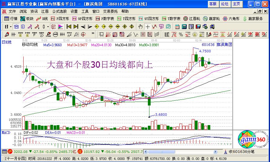 3.若大盤(pán)30日均線向上,個(gè)股30日均線也向上,此時(shí)出現(xiàn)的早晨十字星或者早晨之星k線組合,建議激進(jìn)型投資者可積極買(mǎi)進(jìn),穩(wěn)健型投資者可分批買(mǎi)進(jìn)。