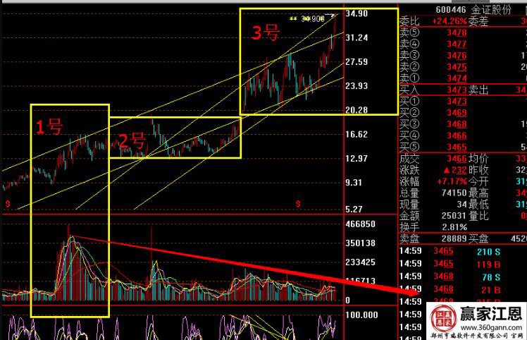 在2014年的歷史上的走勢中,該股同樣是標(biāo)準(zhǔn)的1號放量,2號震蕩,3號放量,當(dāng)然圖中顯示最后的放量已經(jīng)到頭了。