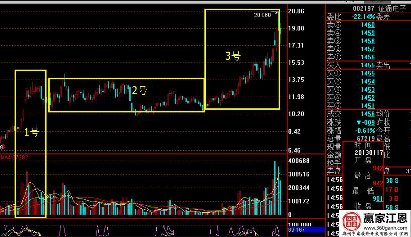 下圖是三泰控股在2014年的部分歷史走勢,為了方便大家的理解,小編將其劃分為了三個區(qū)域,這三個區(qū)域是非常明顯的,如下圖所示。圖中的1號區(qū)域及時集中放量的區(qū)域,這個位置就是主力高位建倉的位置,建倉后,一直在放量價格以上。