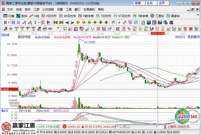 打開股票軟件找到了符合上面條件的凌鋼股份。該股在2000年5月上市,如上圖所示,在上市之后,股價一直是以9元為軸心來進行上下反復的震蕩,在7月6日的時候,股價從8.8元附近起步,展開了一輪快牛行情,連續(xù)拉了四個漲停。7月13日時候股價最高沖到了14.72元,之后該股見頂回落,后面的走勢是一蹶不振,股價一路陰跌。