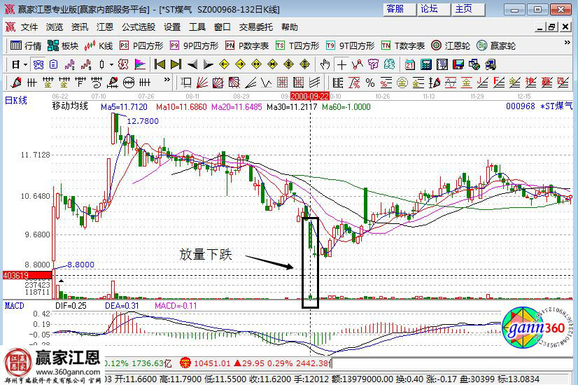 神州股份在2000年6月22日上市,當日最低價8.8元,7月12、13日僅拉兩根長陽線見頂回落,整體漲幅僅20%,9月26日最低探至9.02元,離前期低位僅半步之遙,該股9月22日放量下跌,10月23日突破中短期均線,完全符合我們所說的額搶反彈的標準,所以這種操作投資者是可長可短,進退自如。