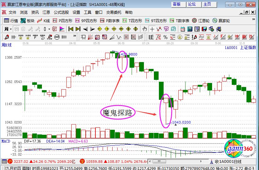 如上圖所示,1998年6月19日,滬市大盤(pán)在一周里(15日-19日)拉出62點(diǎn)長(zhǎng)下影線,但隨后在下一周又出現(xiàn)大陰線,此時(shí)認(rèn)為這條下影線即是下探性影線——“魔鬼探路”,股價(jià)隨后還將繼續(xù)下跌。事實(shí)上,股指又下跌了相當(dāng)一段時(shí)間。又如在1998年8月21日一周里拉出109點(diǎn)的下影線,在隨后的第三周K線則拉出中陽(yáng)線,股價(jià)隨后展開(kāi)了震蕩揚(yáng)升的行情。股指在2100點(diǎn)的高位又拉出了達(dá)77點(diǎn)的下影線,而此條下影線屬于“魔鬼探路”還是“定海神針”?。