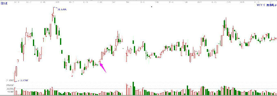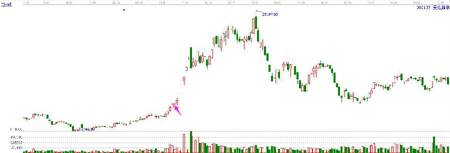 在上漲過(guò)程中,前面一根大陽(yáng)線,在大家都認(rèn)為要開(kāi)始一波行情,積極看好的時(shí)候,第二天卻收出來(lái)一個(gè)十字星,這會(huì)給投資者一種個(gè)股也沒(méi)有那么強(qiáng)勢(shì)的錯(cuò)覺(jué),然后會(huì)選擇逢高出局,結(jié)果后市連續(xù)快速拉升,不再給散戶介入的機(jī)會(huì)。這是一種很典型的洗盤(pán)手法,將浮籌洗出之后,輕裝上陣?yán)_(dá)到自己的目的。遇到這樣的十字星,一定要耐心,堅(jiān)定,勝得過(guò)莊家的“流氓”行為,才能賺得后面的大幅利潤(rùn)。