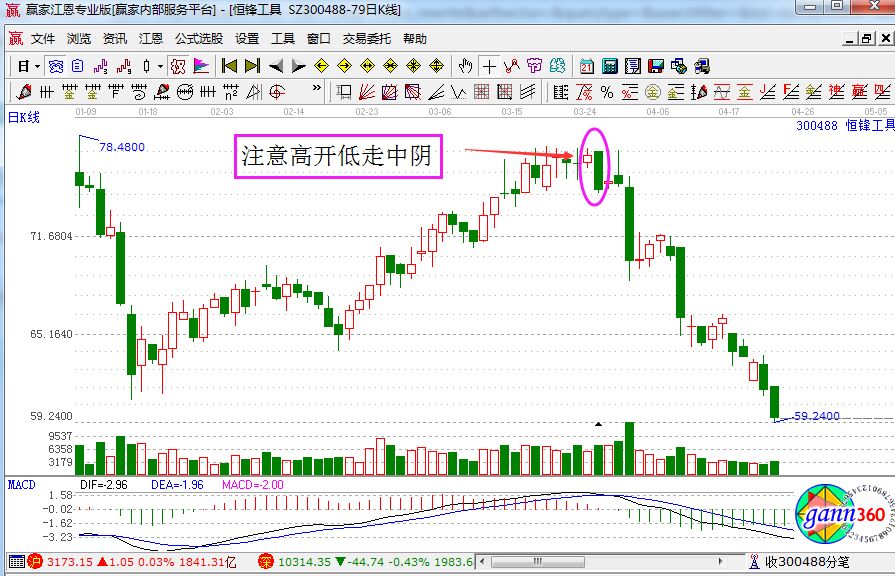 當(dāng)個股在一定的拉升之后,出現(xiàn)高開低走,收中陰線的時候,說明市場繼續(xù)拉升的意愿不強(qiáng),很可能是中線持倉者在大量的拋售,后面很可能繼續(xù)回調(diào),所以要及時的出局,防止被套。
