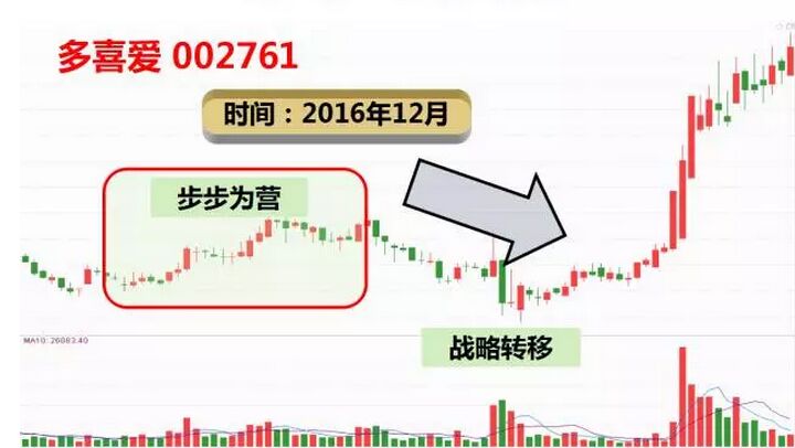 北新路橋和多喜愛的前期K線圖形滿足步步為營的形態(tài),當股價上漲,成交量放大;股價下跌,成交量萎縮。這就說明主力資金在緩慢的吸籌。當主力資金吸籌比較充分之后,一般會向下砸盤,洗出浮籌,浮籌清洗完畢,主力拉升也就開始,股價就不會再回到前期的平臺成本區(qū)間了。