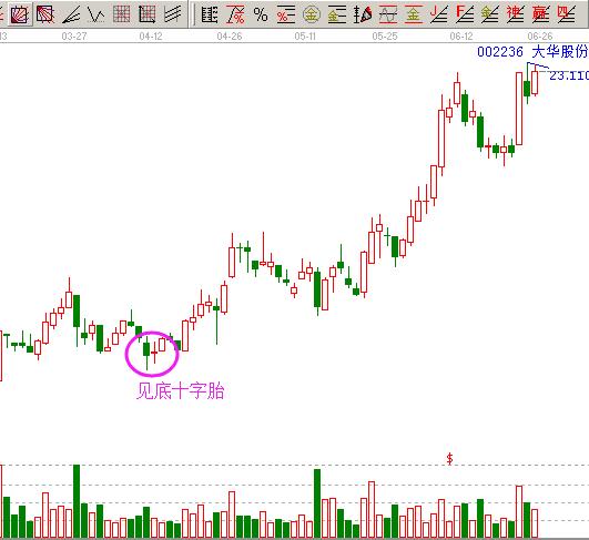 在下跌時(shí)候出現(xiàn)中大陰線,隨后出現(xiàn)跳空高開并出現(xiàn)十字走勢,為重要的見底信號(hào)。