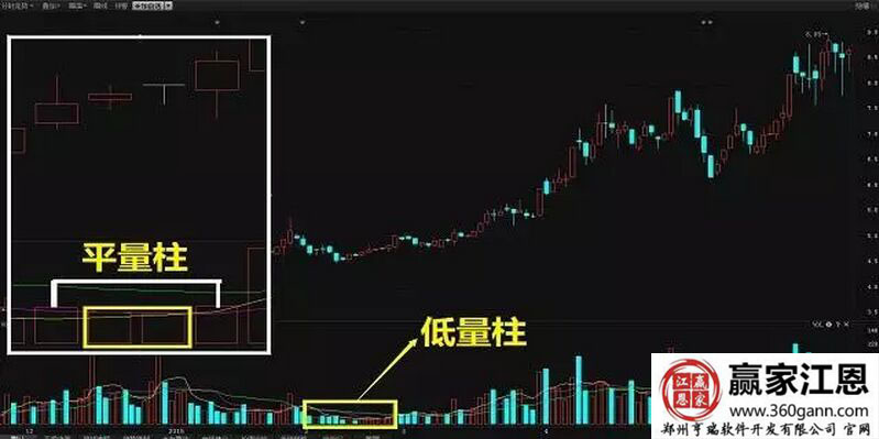 我們運(yùn)用股票軟件所選出的一只股票的截圖。這一只股票,當(dāng)人本人運(yùn)用這兩種量柱的方法輕松拿到了40個(gè)點(diǎn)。圖中黃框內(nèi)的位置其實(shí)就是很多人說的量坑位置,在這個(gè)位置的成交來滾你是非常小的,所以就是低量柱,它是成交量最小的一個(gè)階段,這根量柱是市場(chǎng)起漲的先兆。白框內(nèi)黃色小框里的兩根量注基本上是一樣的,所以說就是平量柱。