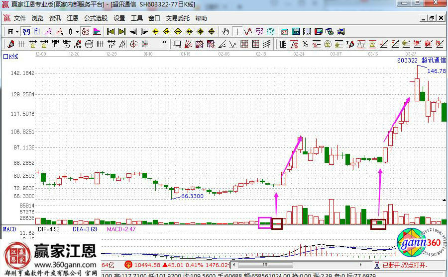 所謂的黑馬量柱就是平量柱+低量柱。具體的描述就是即使平量柱又是低量柱的,低量柱和平量柱是相鄰的。這些都是主力已經(jīng)高度控盤的表現(xiàn),是非常容易產(chǎn)生黑馬的,所以值得關(guān)注。接下來看超訊通信的走勢(shì)圖。