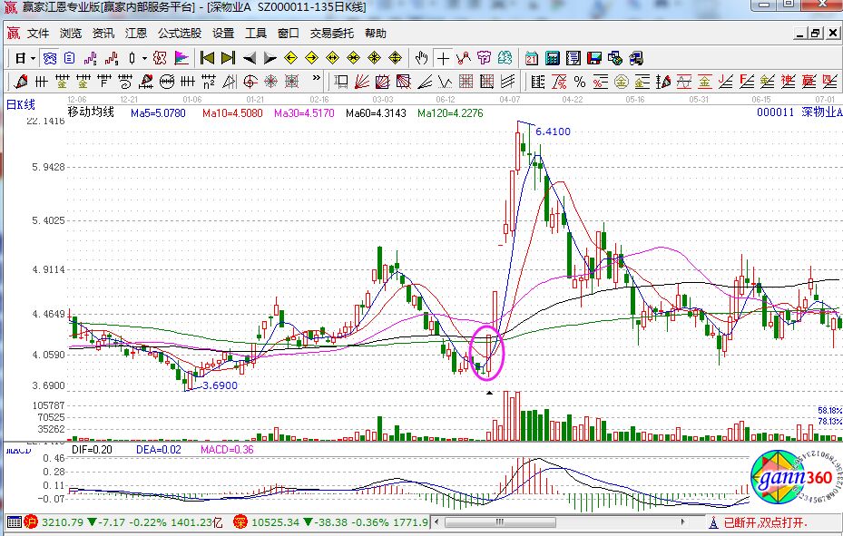 歷史上的深物業(yè)A的走勢(shì)中,05年3月30日的出現(xiàn)了漲停缺口,并且6月3日的回調(diào)正好在這個(gè)漲停缺口處得到了支撐,隨后中線出現(xiàn)了一次極好的獲利機(jī)會(huì),如上圖所示。