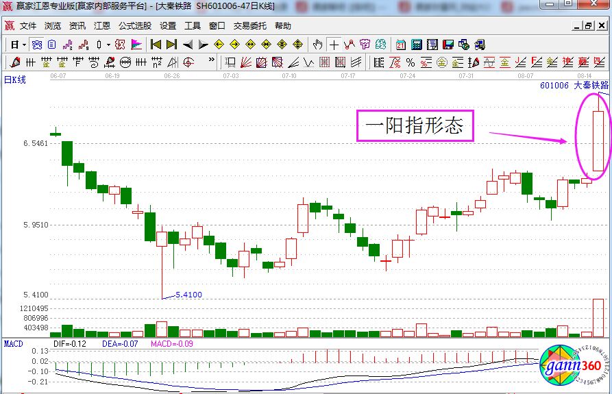 上圖是中南重工在2013年8月份的走勢(shì)圖,該股前期在經(jīng)過(guò)一波下跌之后,在低位形成了緩慢爬升的個(gè)股,圖中該股在8月8日股價(jià)放量拉升,而且成交量相比前幾日明顯的放大,這樣就是形成了比較典型的一陽(yáng)指形態(tài)。所以在當(dāng)天尾盤股價(jià)放量上攻漲勢(shì)確立后果斷的以7.46元的價(jià)位進(jìn)行買入,在次日以4.59元的價(jià)位賣出,盈利1.56%。