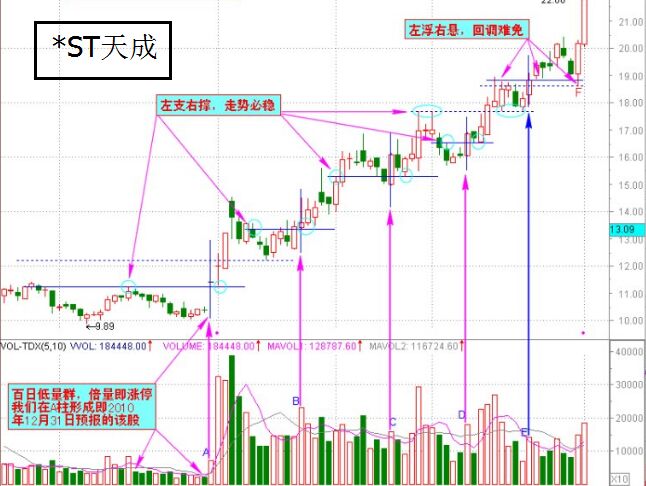 根據(jù)上面的特點(diǎn),那我們?cè)谡覍な旨艿臅r(shí)候就會(huì)非常的簡(jiǎn)單了。具體的就是:首先找到走勢(shì)重工的將軍柱,用豎線標(biāo)示出來(lái),其次就是換出該將軍柱的攻防線,最后就是講共防線切合該線病形成了左支右撐形態(tài)的,那就是黃金十字架了,如下圖中的*ST天成走勢(shì)圖。