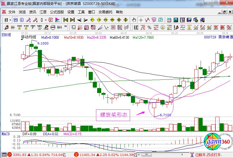 投資者可以按照三天法則來進(jìn)行操作。首先確定出二分位,找出中軸線,螺旋槳重心在中軸線之上運(yùn)行,則向上旋,在中軸線之下運(yùn)行,則向下旋。其次在連續(xù)三天股價(jià)均在二分位之上,則后市股價(jià)上漲,在三天后當(dāng)股價(jià)突破螺旋槳的最高價(jià),同時(shí)放量滿足135均線,那么則意味著上漲走勢確立了。