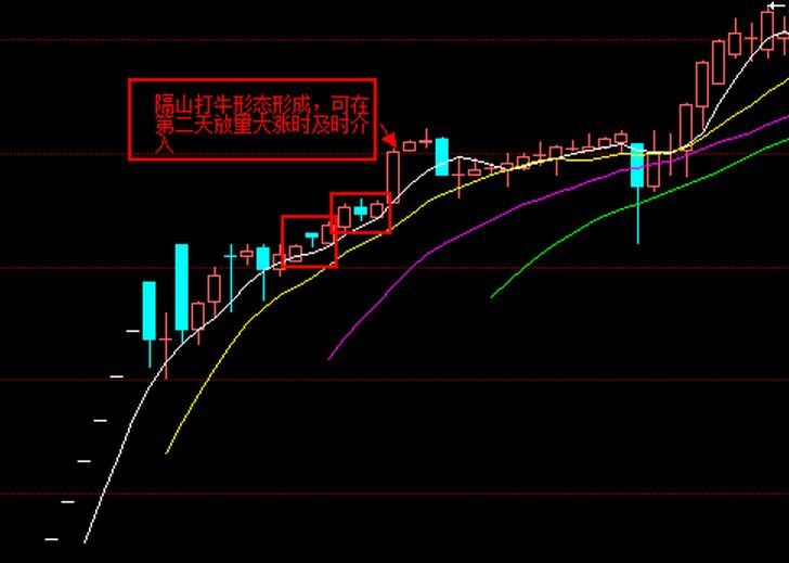 隔山打牛形態(tài)中的第一組3根K線出現(xiàn)的時候,應(yīng)該保持對于股票走勢的高度關(guān)注,在第二組3根K線即將要形成的時候,可以在第二組的第三根陽線即將吞沒第二根陰線時介入,在隔山打牛形態(tài)形成之后,也是可以在次日盤中放量上攻的時候介入。