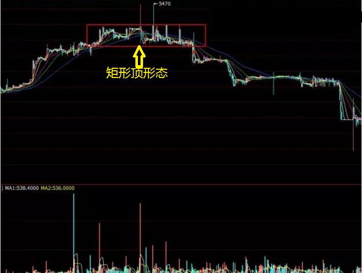 矩形頂形態(tài)是怎么樣子的?它其實(shí)指的就以在一個(gè)頭部區(qū)域走出了一個(gè)箱體走勢(shì),在這個(gè)區(qū)域內(nèi)K線頂部有阻擋,下端有支撐,在價(jià)格上大致維持了一個(gè)箱體震蕩的格局。如下圖所示。