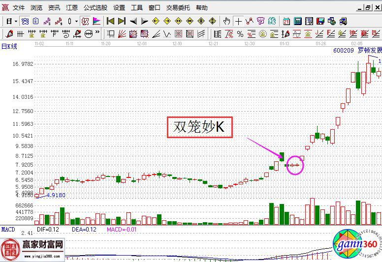 雙籠妙K是由兩個(gè)實(shí)體并列的小中陽組成的組合妙K,一般來說只要符合此形態(tài)的話,才會(huì)有比較大的抓漲停的成功率,而且在普通的股低位出現(xiàn)這個(gè)組合成功率比較高,但是大陽概率低。接下來我們來看羅頓發(fā)展的走勢圖。