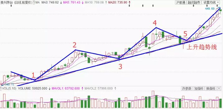 上面是貴州茅臺(tái)的走勢(shì)圖,從圖中可以看到:連接該股票的每一波的波谷可以劃一條上升趨勢(shì)線,該股票一直延續(xù)該條線保持上升趨勢(shì)。我們標(biāo)注每一波的波峰和波谷會(huì)發(fā)現(xiàn)4>2、5>3>1,也即形態(tài)為過(guò)高不破低形態(tài),所以,當(dāng)下次我們碰到這種過(guò)高不破低形態(tài)的股票時(shí)即可找時(shí)機(jī)選擇買(mǎi)入布局。