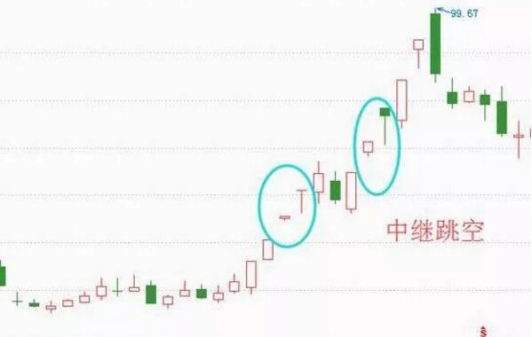 用股票軟件打開K線圖研究中繼跳空,就會(huì)發(fā)現(xiàn)中繼跳空通常是發(fā)生在新的市場(chǎng)趨勢(shì)、發(fā)展果一段時(shí)間之后,大約在整個(gè)趨勢(shì)的中間階段。價(jià)格跳躍前進(jìn),形成一個(gè)個(gè)跳空,這陽的走勢(shì)就是中繼跳空。它的技術(shù)特征為:在趨勢(shì)中間階段發(fā)生,成交量表現(xiàn)一般是處于不大不小的狀態(tài)。相應(yīng)的圖形如下。