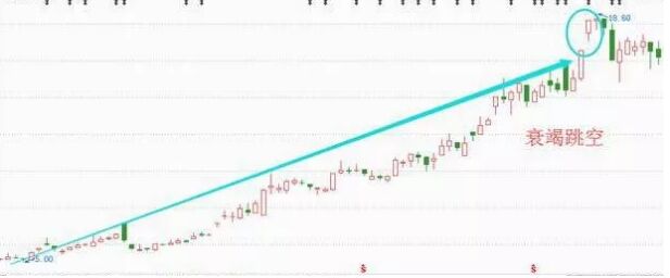 衰竭跳空的表現(xiàn)是怎么樣的?它其實(shí)容易發(fā)生在市場(chǎng)運(yùn)動(dòng)的尾聲。在上升趨勢(shì)的最后階段價(jià)格嚴(yán)責(zé)原來的方向進(jìn)行最后的沖刺,虛晃一槍,因此在上漲趨勢(shì)末端,很多散戶受惑于這種跳空,而紛紛高位套牢。技術(shù)特征:在上漲(或下跌)趨勢(shì)的末端,出現(xiàn)在已經(jīng)發(fā)展的趨勢(shì)當(dāng)中,跳空方向同趨勢(shì)方向相同,且成交量巨大。如下圖所示。