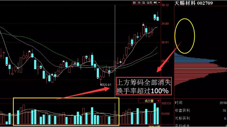 3、板塊二次吸籌完畢后啟動(dòng)。板塊二次吸籌后啟動(dòng)是指該板塊經(jīng)過一輪上漲后,大部分股票主力幾乎全部出貨,然后經(jīng)過大幅下跌新的主力重新吸籌,吸籌完畢的特征是該板塊大部分股票前期套牢盤機(jī)會割肉出局,上方套牢籌碼消失轉(zhuǎn)移到下方,股票經(jīng)過100%的換手。如下面的天賜材料走勢圖。