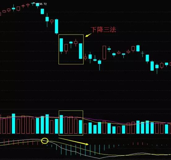 如上圖所示,當(dāng)形態(tài)走出后,可以發(fā)現(xiàn),這5根K線形態(tài)類似矩形盤整,最后大陰線的創(chuàng)新低實(shí)際是跌破矩形盤整,因此K線后續(xù)仍是下降趨勢(shì)。當(dāng)該形態(tài)形成后,投資者最好觀察一下副圖指標(biāo)macd,如果macd剛形成死叉不就,或沒(méi)有明顯止跌回升跡象,則更可確認(rèn)后市將繼續(xù)下跌。