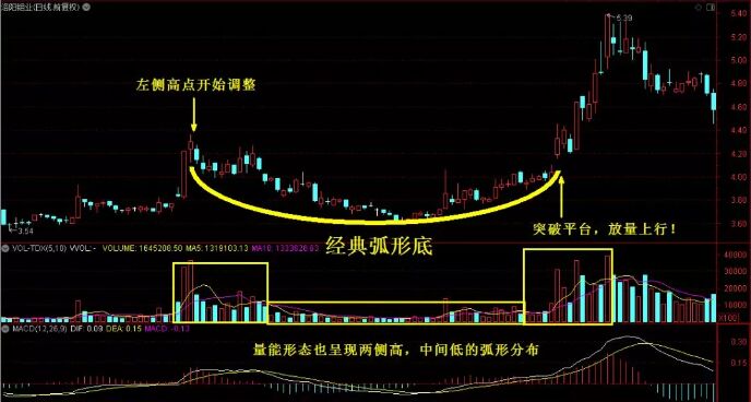 從上圖我們可以看到,這個(gè)經(jīng)典的形態(tài),可以分為圓弧的左半部分與圓弧的右半部分。左半部分是跌的過(guò)程,而右半部分是漲的過(guò)程,一般是比較流暢,一般是比較曲折。漲的過(guò)程,尤其是在面臨突破前,不可避免地會(huì)面臨著反復(fù),只要能保持相對(duì)強(qiáng)勢(shì),成交量也能出現(xiàn)明顯放大,最終一旦突破上去,漲起來(lái)的空間就會(huì)更廣闊。