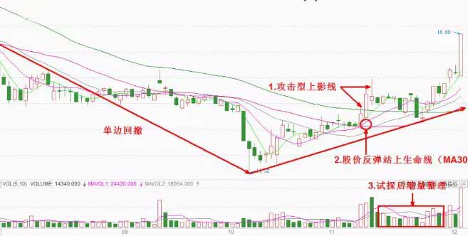 如上圖所示,這個反轉信號出現(xiàn)了攻擊型上影線外,還是需要兩個輔助量的,即股價站穩(wěn)30日均線,回撤后縮量。