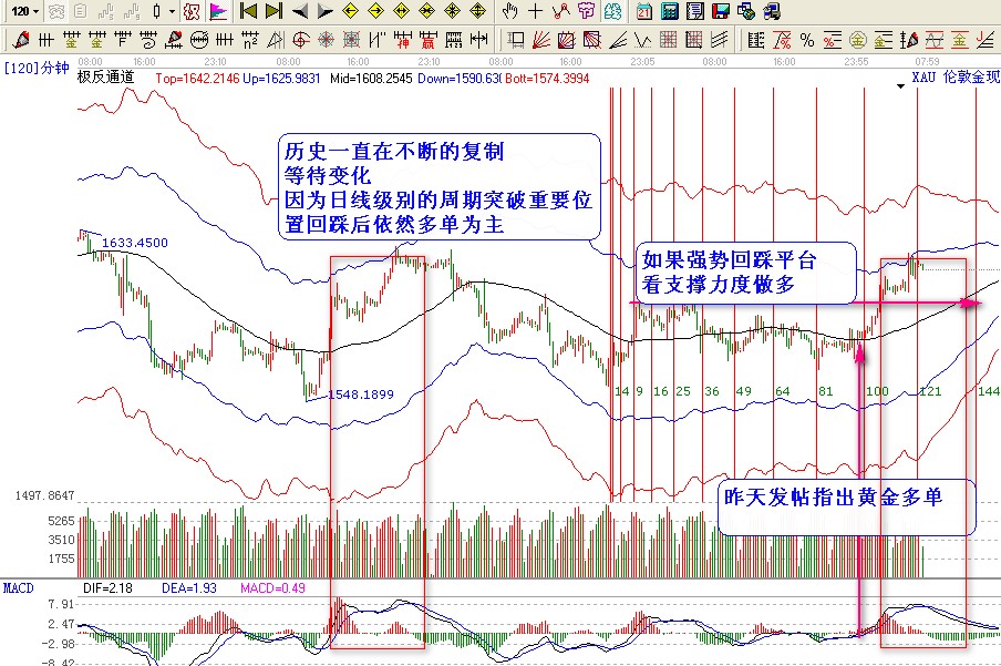 然后引發(fā)了一輪暴跌,但是這次是日線突破重要的壓力線位置,日線開始強(qiáng)勢,回踩就有所減免,回踩反而是多單的位置說以關(guān)鍵位置還是macd指標(biāo)的構(gòu)成過程跟下跌的幅度,120分時(shí)間周期中極反通道生命線更跟前期的平臺(tái)位置構(gòu)成了極強(qiáng)的支撐力度,回踩這個(gè)位置不破可以多單。。。。。