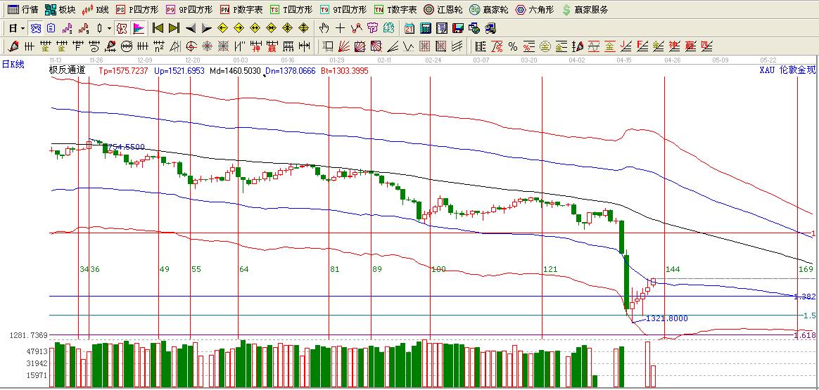這樣看黃金做起來(lái)就沒(méi)有那樣多的一個(gè)麻煩了。當(dāng)大家都在恐慌的時(shí)候,黃金跌至黃金分割延伸線1.5的位置跟極反通道紅色下軌道線,開(kāi)始了止跌上行,很多人再一次被玩于股掌之中。這就是極反通道的魅力。超脫了一切技術(shù)指標(biāo)。