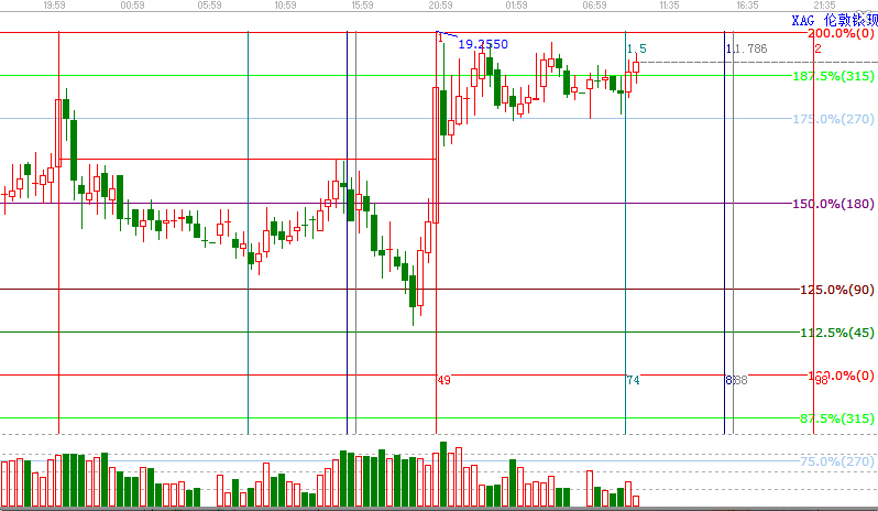 白銀市場(chǎng)趨勢(shì)依然趨于向上,目前圍繞在江恩90度與0度位置震蕩調(diào)整,支撐19.17,0度阻力19.25,90度位置不破,會(huì)有小幅上沖,目標(biāo)位0度位置  ,今日整體行情趨于平淡,觀望情緒濃重,大家可結(jié)合0度--90度區(qū)間高拋低吸,箱體如突破,看高一線,阻力45度,19.32.(支撐和阻力可相互轉(zhuǎn)化,大家和結(jié)合位置做決定)時(shí)間方面,重要的8:30分,15:00.投資者盤中可密切留意時(shí)間窗口,結(jié)合盤中位置做策略。 【如有疑問,請(qǐng)聯(lián)系贏家客服】