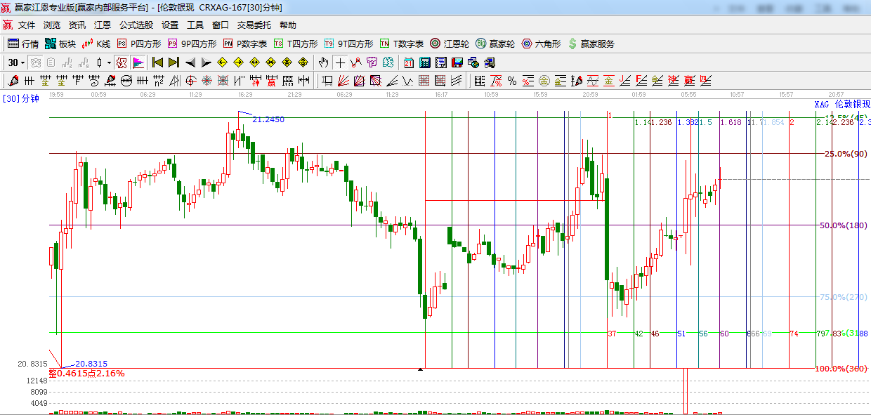 近期白銀依然維持區(qū)間震蕩,今日關(guān)注江恩90度強(qiáng)阻力位21.17, 45度21.23,此位置如不能突破,可以適當(dāng)小幅放空,下方支撐價(jià)格180度,21.06.(支撐和阻力可相互轉(zhuǎn)化,大家和結(jié)合位置做決定)今日時(shí)間方面09:00, 11:30 ,13:30, 16:00,18:30,20:30,23.00投資者盤中可密切留意時(shí)間窗口,結(jié)合盤中位置做策略【如有疑問,請聯(lián)系贏家客服】 30分圖