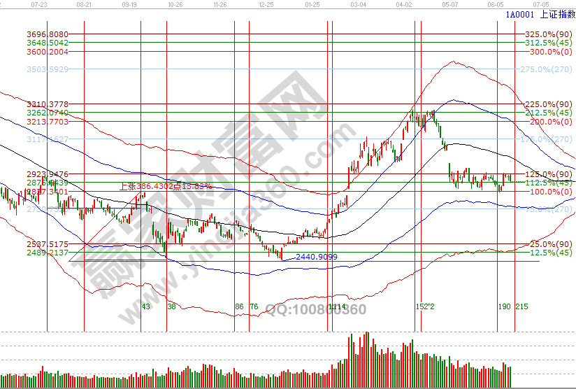 指數(shù)高開后一路震蕩走低,收盤正好落在近幾天談到的關鍵位2880附近,周一17號是日線時間窗口,關注好周末外部因素動態(tài),江恩價格四方形、60分鐘極反通道生命線(2880-2890)區(qū)間能守住則反彈延續(xù),失守則策略調(diào)整為區(qū)間交易法應對,下方波段百分比延伸線1倍循環(huán)180度2834點依然是強支撐。最后說下,自5月以來對市場定性的為反彈,并且給出第一目標位2950位置,第二目標位是日線黑色生命線,保持平和的心態(tài)應對市場。6月17號盤中支撐是0度2860點、315度2844點,盤中壓力是90度2894、135度2911點。操作策略,指數(shù)處于極反通道弱勢區(qū)域的反彈走勢,時間窗口關注好2880-2890區(qū)間得失,整體持倉保持3-5成。