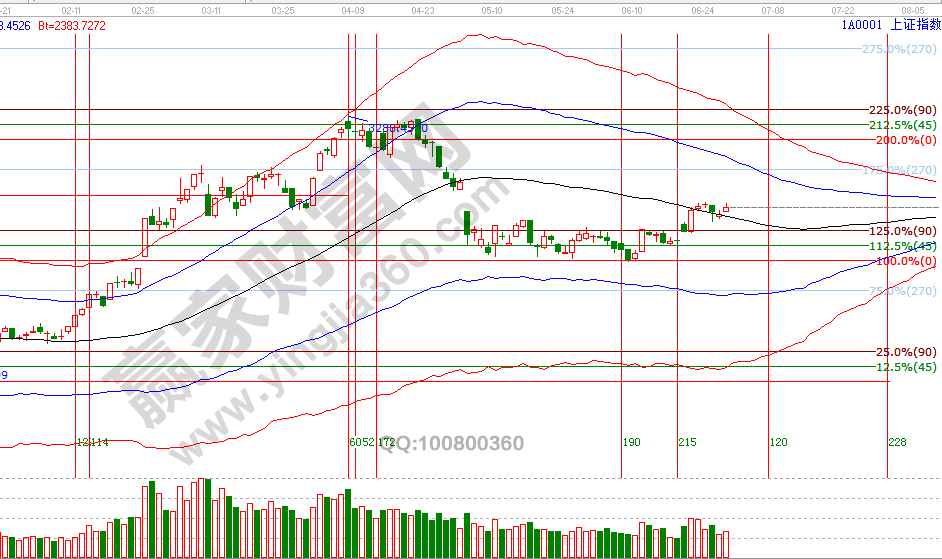 截至今日收盤A股滬深指數(shù)時隔39個交易日再度雙雙收復(fù)極反通道生命線,先行指數(shù)上證50已上攻至藍(lán)色上軌線反壓附近,結(jié)合各周期走勢大盤將延續(xù)反彈動作;空間點位方面,江恩價格四方形、波段百分比線工具顯示,3016-3036區(qū)間同極反通道短周期共振,按買在支撐賣在壓力原則,2840附近支撐位買入,第一目標(biāo)位2950減一次倉,接下來3016-3036區(qū)間附近又一次分批獲利參考位;時間方面,7月3號是下一個日線時間窗口,6月27號盤中壓力是45度3016點、90度3036點,盤中支撐是270度2961點、315度2978點。操作策略,指數(shù)極反通道生命線附近震蕩,反彈延續(xù)中,整體持倉保持3-5左右。