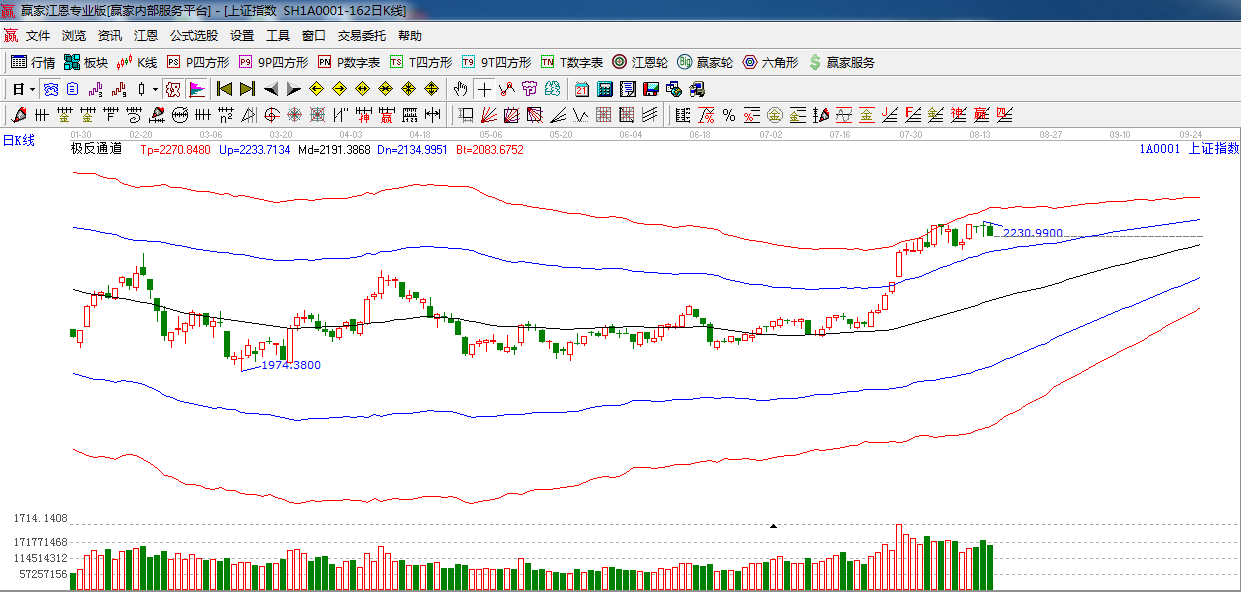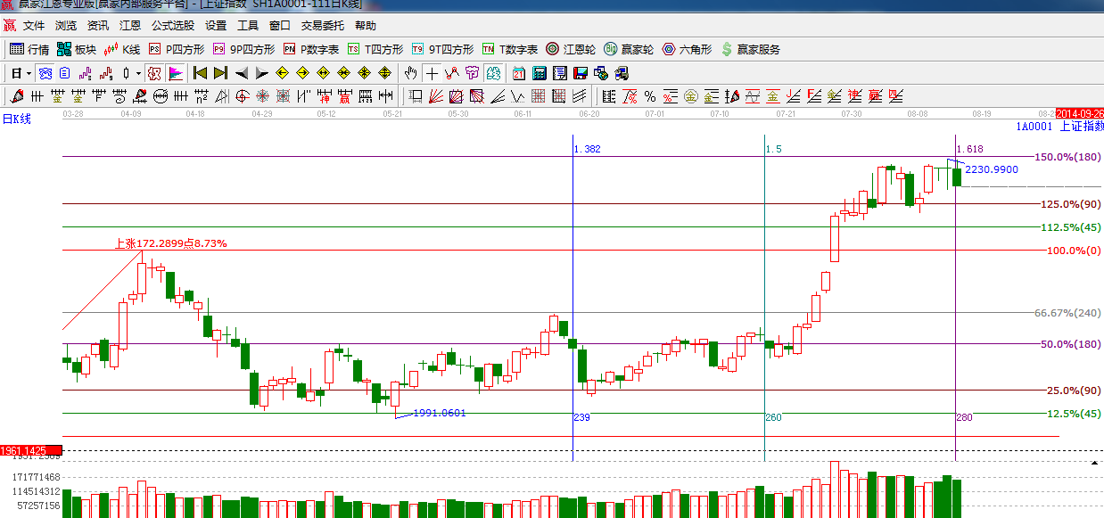 ★依據(jù)贏家江恩系統(tǒng)波段百分比提示:上方阻力180度2232點(diǎn),下方支撐江恩90度位置是2189點(diǎn),江恩45度2168點(diǎn)附近。