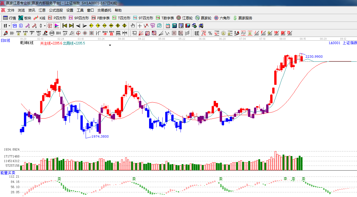 ★依據(jù)贏家江恩系統(tǒng)乾坤K線提示: 沖高回落,破位綠色出局線,短線看空,波段看多。