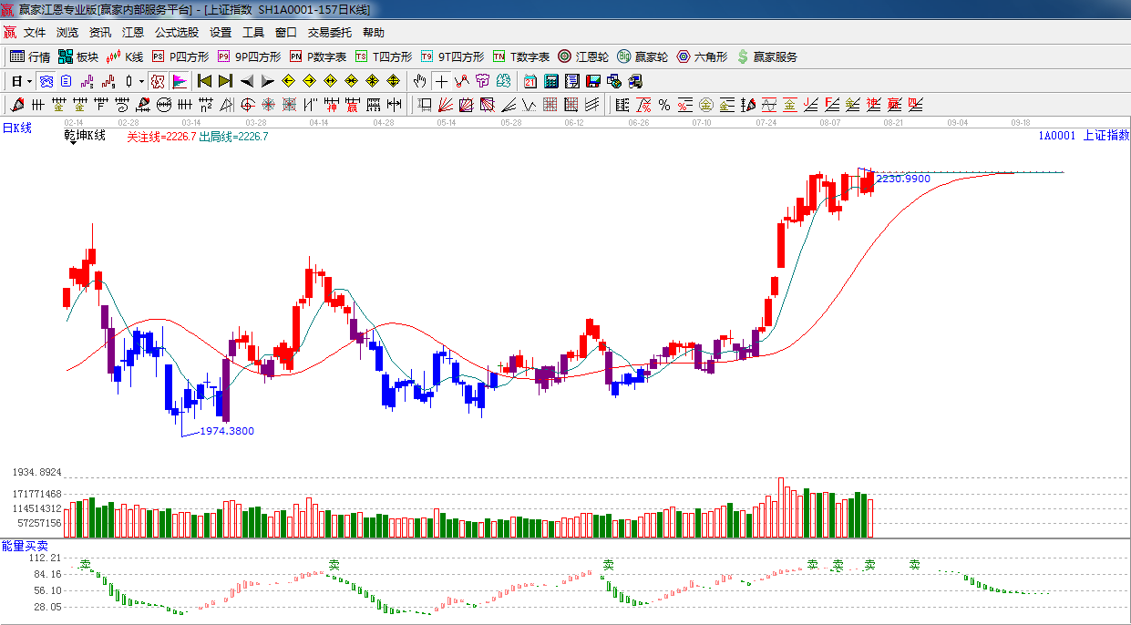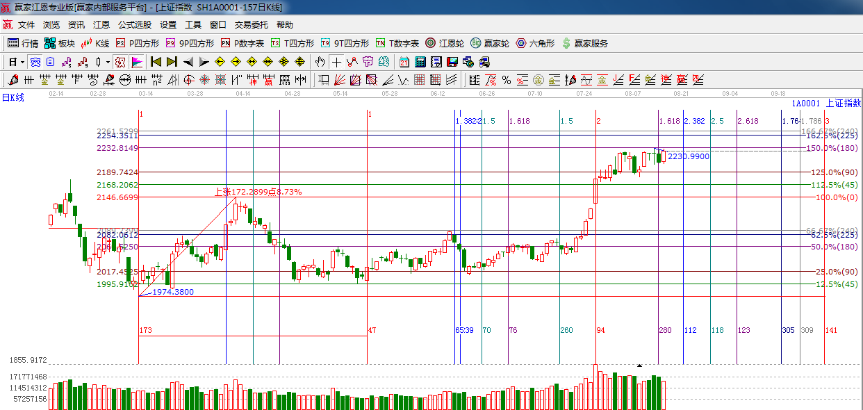 江恩看盤綜述:依據(jù)贏家江恩技術(shù)工具分析得出:,指數(shù)受利好推動(dòng)展開(kāi)反彈,但180度2232點(diǎn)阻力憂在,量能較前一交易日萎縮,短期市場(chǎng)仍有震蕩可能,但中期向上趨勢(shì)良好。操作上,合理控制倉(cāng)位,做好高拋低吸。